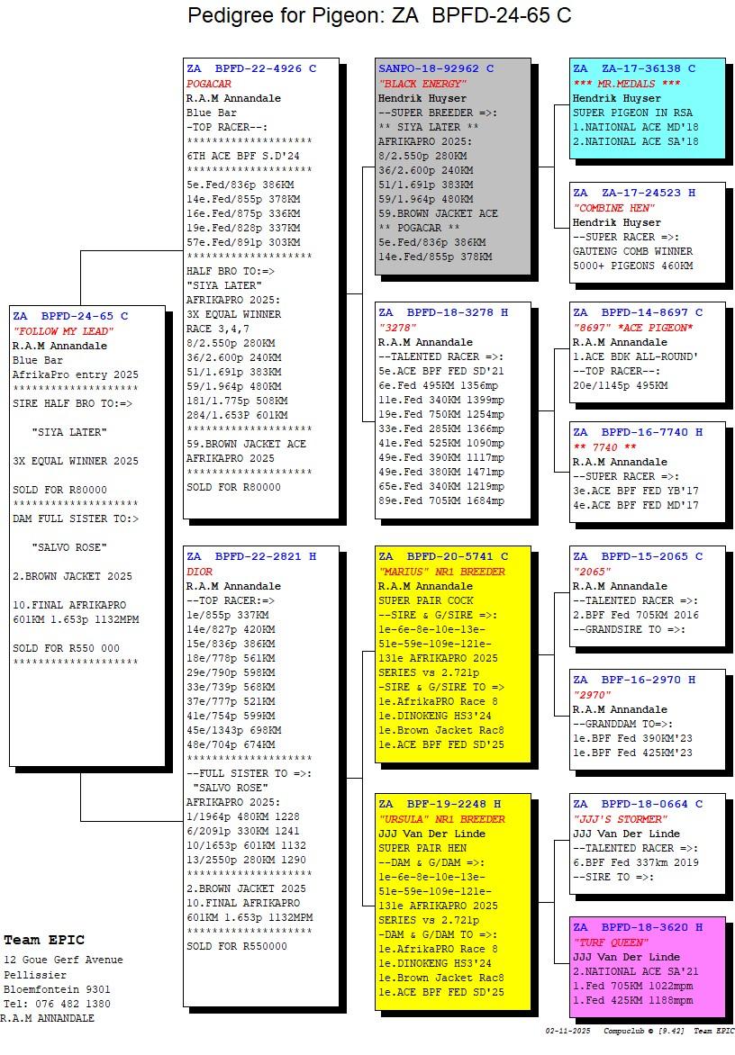 ZZ..LOT 100 AFRIKAPRO AUCTION 4 -R.A.M Annendale-ZA-24-BPFW-65 -SIRE HALF BRO TO:=>”SIYA LATER” 3X EQUAL WINNER 2025 SOLD FOR R80000 ******** ********** DAM FULL SISTER TO:>”SALVO ROSE”2.BROWN JACKET 2025 , 10.FINAL AFRIKAPRO 601KM 1.653p 1132MPM SOLD FOR R550 000———-SIRE:ZA BPFD-22-4926 C “POGACAR”. R.A.M Annandale.6TH ACE BPF S.D’24, 5e.Fed/836p 386KM, 14e. Fed/855p 378KM, 16e. Fed/875p 336KM, 19e. Fed/828p 337KM, 57e. Fed/891p 303KM. HALF BRO TO:=> “SIYA LATER” AFRIKAPRO 2025: 3X EQUAL WINNER RACE 3,4,7. SOLD FOR R80 000.00. 8/2.550p 280KM, 36/2.600p 240KM, 51/1.691p 383KM, 59/1.964p 480KM, 181/1.775p 508KM, 284/1.653P 601KM.———-DAM:BPFD-22-2821 H.DIOR R.A.M Annandale –TOP RACER:=> le/855p 337KM, 14e/827p 420KM, 15e/836p 386KM, 18e/778p 561KM, 29e/790p 598KM, 33e/739p 568KM, 37e/777p 521KM, 41e/754p 599KM–FULL SISTER TO =>: “SALVO ROSE” AFRIKAPRO 2025: 1/1964p 480KM 1228, 6/2091p 330KM 1241, 10/1653p 601KM 1132. 13/2550p 280KM 1290.2. BROWN JACKET 2025 10.FINAL AFRIKAPRO 601KM 1.653p 1132MPM. SOLD FOR R550 000.00.SEE PEDIGREE!!!