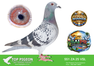 LOT 10 SAIPR SUMMER AUCTION 1 – VSL & Ignis 1- VSL 551 2025 – FINAL RACE WINNER WINNING R475 000.00——–SIRE:11 ZA VSL 23 SUPER ELEVEN Colou BCWF MELT’S BEST KITTEL BRED FOR STOCK SUPER ELENEN BEST KITTEL. SUPER BREEDER OF WINNERS AND ACE BIRDS.SIRE OF SUMMER FINAL SAIPR WINNER 2026 AND 3RD GRAND AVER WINNER.—————-DAM:1648 ZA WPU 21 SIS TOONTJIES Colou BB ORNAT/ROCKET/MONA LISA SUPER BREEDER. DAM OF SAIPR SUMMER FINAL WINNER 2026 AND 3RD ACE BIRD.SEE PEDIGREE!!!!