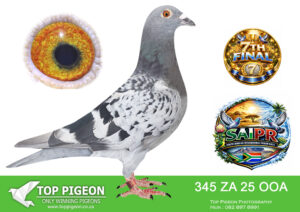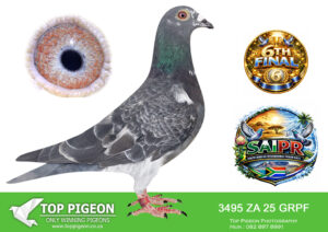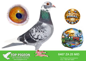 LOT 24 SAIPR SUMMER AUCTION 1 – Theuns Victor- VICTOR 107 2025 -9th Final Race WINNING R30 000.00——–SIRE:483 ZA 19 OOA .Alias “MR WOW” Strain: Tom Lock/Sablon Color: Blue Bar SUPER RACER 8 WEEKS IN A ROW FOR OOA LOFTS!! 7th Club, 18th VPU, Glen, Y/B, 286km, 1369mpm – 1993 pigeons 11th Club, 47th VPU, Tom’s Place, Y/B, 323km, 1416mpm – 2113 pigeons 49th Club, 152nd VPU, Springfontein, Y/B, 424km, 1014mpm————DAM:6493 ZA 21 KUR.Strain: Sablon/Tom Lock Color: Blue Bar.SEE PEDIGREE!!!!