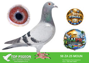 LOT 20 SAIPR SUMMER AUCTION 1 – Mountain Lofts-Murray and Mills- MOUN 56 2025 -EQUAL 2N (3rd ) SAIPR FINAL SUMMER SERIES – 444KM VEL 1164MPM WINNING R120 000.00–1ST SAIPR H0TSPOT 1 – BOTHAVILLE 178KM -VEL 1099 MPM WINNING R25 000.00–5TH HOTSPOT 2 EQUAL WINNER –6TH HOTSPOT 4—-FULL BROTHER FLEW 18TH FINAL AFRIKAPRO 2025—-SIRE:ZA 22 MOUN 435 .Alias “TRUE IMAGE” Strain: MOUNTAIN LOFTS Color: BLUE BAR ”TRUE IMAGE” ZA23 MOUN 435 PERFORMANCE -2024 1ST ACE ALLROUND TPA – 2024 1ST ACE OPEN SERIES TPA – 2024 1ST ACE WEST ROUT TPA 10 WEEKS IN A ROW FROM 339KM TO 680KM – 2024———— DAM: “FLIGHT FUEL” ZA19MOUN 697 1ST CLUB ,2ND UNION BLOEMMFONTEIN 440KM 1395 PIGEONS. SHE IS BRED DIRECTLY OUT OF “ALLES ACHT” . HOOYMANS COCK.SEE PEDIGREE!!!!