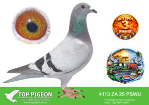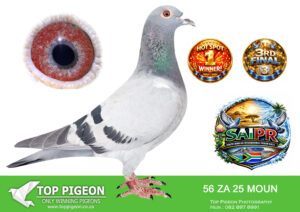 LOT 25 SAIPR SUMMER AUCTION 1 – Gerrie Maritz- PSWU 4113 2025 -11TH FINAL RACE WINNING R20 000.00 , 5TH ACE BIRD , HOTSPOT 3 WINNER WINNING R25 000.00 , 9TH HOTSPOT 4—-Her nestsister was 2nd on Hotspot 3. 1st and 2nd in one nest!———SIRE:126 ZA 22 HHH.Alias “‘ Mr Body seun ‘” Strain: HENDRIK HUYSER Color: Blue Bar Bred from 2 super Pigeons ……the best Sanpo Gold genetics. Look at the pedigree…..Hendrik Huyser and Kings and Gys Louw. Champion fanciers with super pigeons.————DAM:96222 ZA 18 .Alias “”222″” Strain: De Rauw Sablon Color: Blue Bar One of my best racing hens over 3 seasons, a banker. From the first year in the the breeding loft her babies scored. Bred from my proven Sablon lines. See her pedigree.SEE PEDIGREE!!!!
