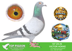 LOT 23 SAIPR SUMMER AUCTION 1 – Theuns Victor- VICTOR 108 2025 -4TH FINAL WINNING R90 000.00——-SIRE:483 ZA 19 OOA .Alias “MR WOW” Strain: Tom Lock/Sablon Color: Blue Bar SUPER RACER 8 WEEKS IN A ROW FOR OOA LOFTS!! 7th Club, 18th VPU, Glen, Y/B, 286km, 1369mpm – 1993 pigeons 11th Club, 47th VPU, Tom’s Place, Y/B, 323km, 1416mpm – 2113 pigeons 49th Club, 152nd VPU, Springfontein, Y/B, 424km, 1014mpm————DAM:6493 ZA 21 KUR.Strain: Sablon/Tom Lock Color: Blue Bar.SEE PEDIGREE!!!!
