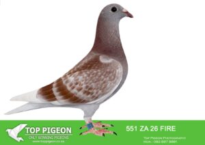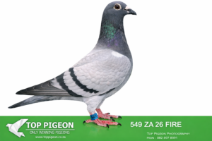 .LOT 2 FULL SIBLING TRPF WINNER – ZA 26 FIRE 549 —FULL SIBLING TO 1ST TRPF FEDERATION WINNER Three Sister on 992 m/m 791km For Dirk Grobler. 1st Alberton Club TRPF Three Sister on 992 m/m 791km For Dirk Grobler——-SIRE: Direct son of the outstanding “Kim 82” (1 MPKD 21 ZA) – a proven breeder and sire of a TRPF Federation Winner (791km, Three Sisters) for Dirk Grobler, also winner of 1st Alberton Club. The sire line is heavily built on the famous Kaasboer dynasty, featuring multiple top-class pigeons such as: “Lucky Kim” – raced at SC Million Dollar Race, top Kaasboer genetics Direct influence of Kaasboer himself (multiple times in pedigree) Strong infusion of Flor Engels blood, known to cross exceptionally well with Kaasboer This line is renowned for producing ace pigeons and consistent winners, especially in middle to long-distance competition.————🧬 DAM — 355 ZA 18 GJT Strain: Smuts × 810 Color: Blue Bar (BB) Key Achievements & Breeding Value Dam to the 1st TRPF Federation Winner Three Sisters – 992 m/min – 791 km for Dirk Grobler Dam to the 1st Alberton Club Winner Same race, same performance line Directly tied to the SUPERBREEDER 810 dynasty, one of the strongest breeding lines in South Africa. Bloodline Highlights Sire is bred direct from the famous Nr.1 pair. Dam is a grandchild of “SUPERBREEDER 810”, a foundation bird responsible for multiple winners and top breeders. Includes “Boytjie,” “Mooie 810,” “Son Superbreeder 810,” and “Superbreeder 8855” — all elite 810‑line producers.SEE PEDIGREE!!!!!