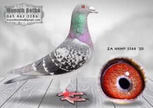 LOT 14 MUNNIK BOTHA – ZA 24 SANPO 22028 -SIRE: 316 ZA HPT 23 – “Twilight Lou Wouter” A well-bred cock, selected and retained specifically for stock purposes. He carries strong foundational genetics linked to proven SANPO and long-distance performance lines. On the sire’s side we find the influence of “Big Daddy” (5108 ZA KHS 14) – a SANPO Gold Medal winner (Best Short Distance pigeon 2017), bred from the renowned Louis & John line. This line is known for consistent top performances and durability.——————–DAM: 523 ZA HPT 24 – “Centauris” A performance-driven hen with excellent race credentials and strong endurance capabilities. She was entered into the DIAZ Federation, where she proved her class: Completed a demanding 10-week race program Competed from distances of 525km to 7 equal winners Achieved multiple equal positions including: 88th, 55th, race 9 (equal winner) Final race: 89th place Also recorded a 3rd position in a CPL Car Race (1185 pigeons).SEE PEDIGREE!!!!