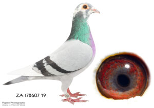 .LOT 9 CORRIE NAUDE – ZA 19 178607 -The Sire of this cock is bred by WILLIAM WARNER Spritzie Jansen Cock and 3 x winner. Best pigeon in the WRRPA and one of the SANPO Gold Medal Short Distance winners. The Dam of this cock is my SA National Pigeon Organisation Silver Medal Winner Short distance 2013. She bred winners.SEE PEDIGREE!!!!