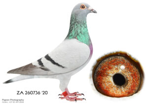 .LOT 1 CORRIE NAUDE – ZA 20 260736 -4 X Winner Kannibaal. This hen have bred winners for us as well. Bred 2nd place ERPF federation winner from Kimberley (650 km)————-SIRE:178777 ZA 20.Inbred Kannibaal Hells Bells sister got 6th possision in the final race at the SAMDPR and Hells Bells I mated to a sister to my 4 x winner to keep the Kannibaal genetics.———DAM:24573 TRPF 14 4 X WINNER KANNIBAAL BB Kannibaal Her 1st offspring was bred in my race loft. (CH Cock 5205, he became the Best Long Distance in the Gauteng Pigeon Union). A top breeding hen in my loft. Excellent racer, best Short Distance bird in GPU. Flew 2nd in the Gauteng Prov. Combine with 7200 pigeons.SEE PEDIGREE!!!